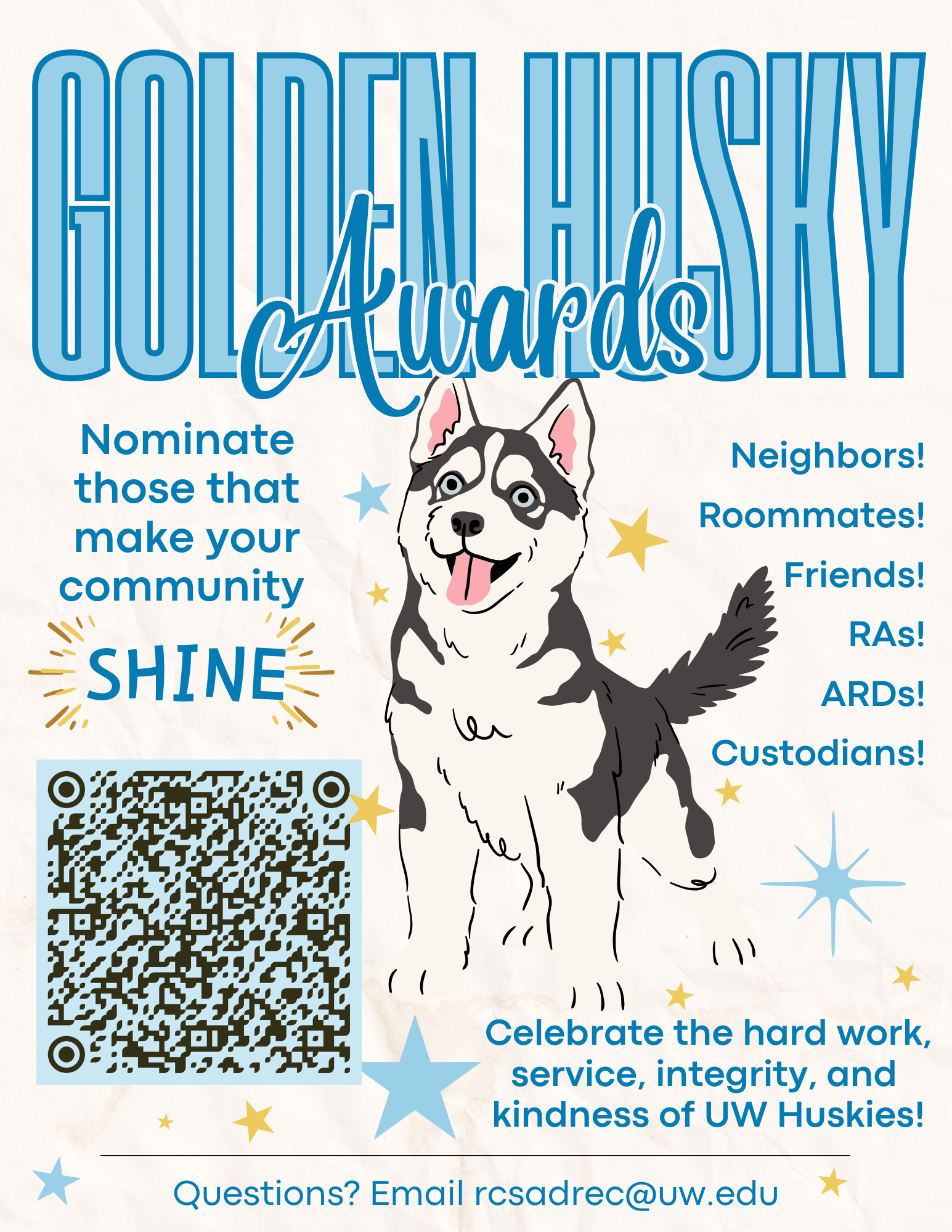The Golden Husky Awards are meant to recognize individuals for all of their valuable contributions, big or small, made within our residential communities! We encourage you to share your appreciation and use this form to name a someone who deserves recognition. All Golden Husky Award winners will receive a postcard with a super cool Husky pin as well as a printed paragraph about the contribution!